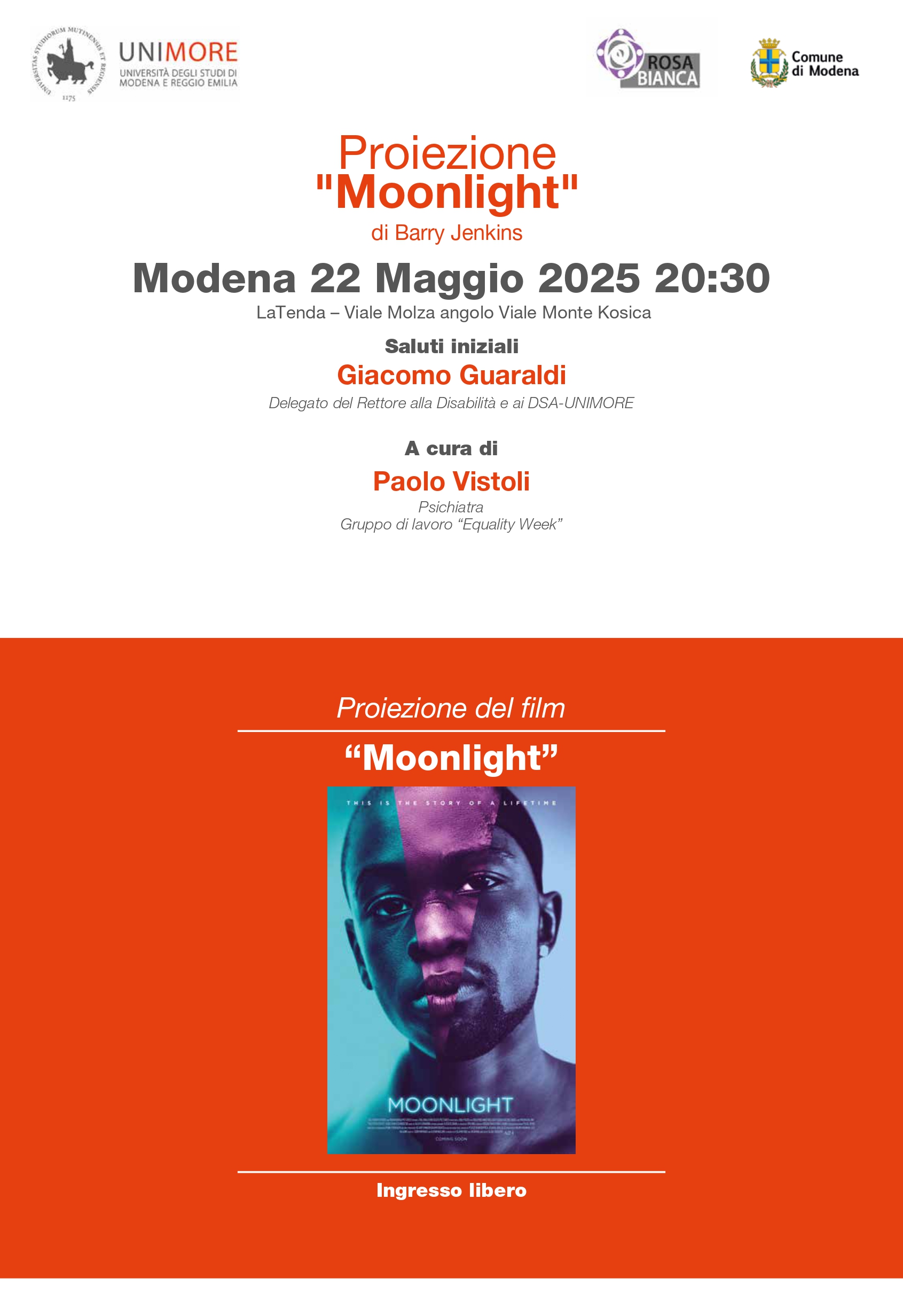 Proiezione del film "Moonlight"Con la partecipazione di Paolo Vistoli Psichiatra eStudenti del Gruppo di lavoro “Equality Week”