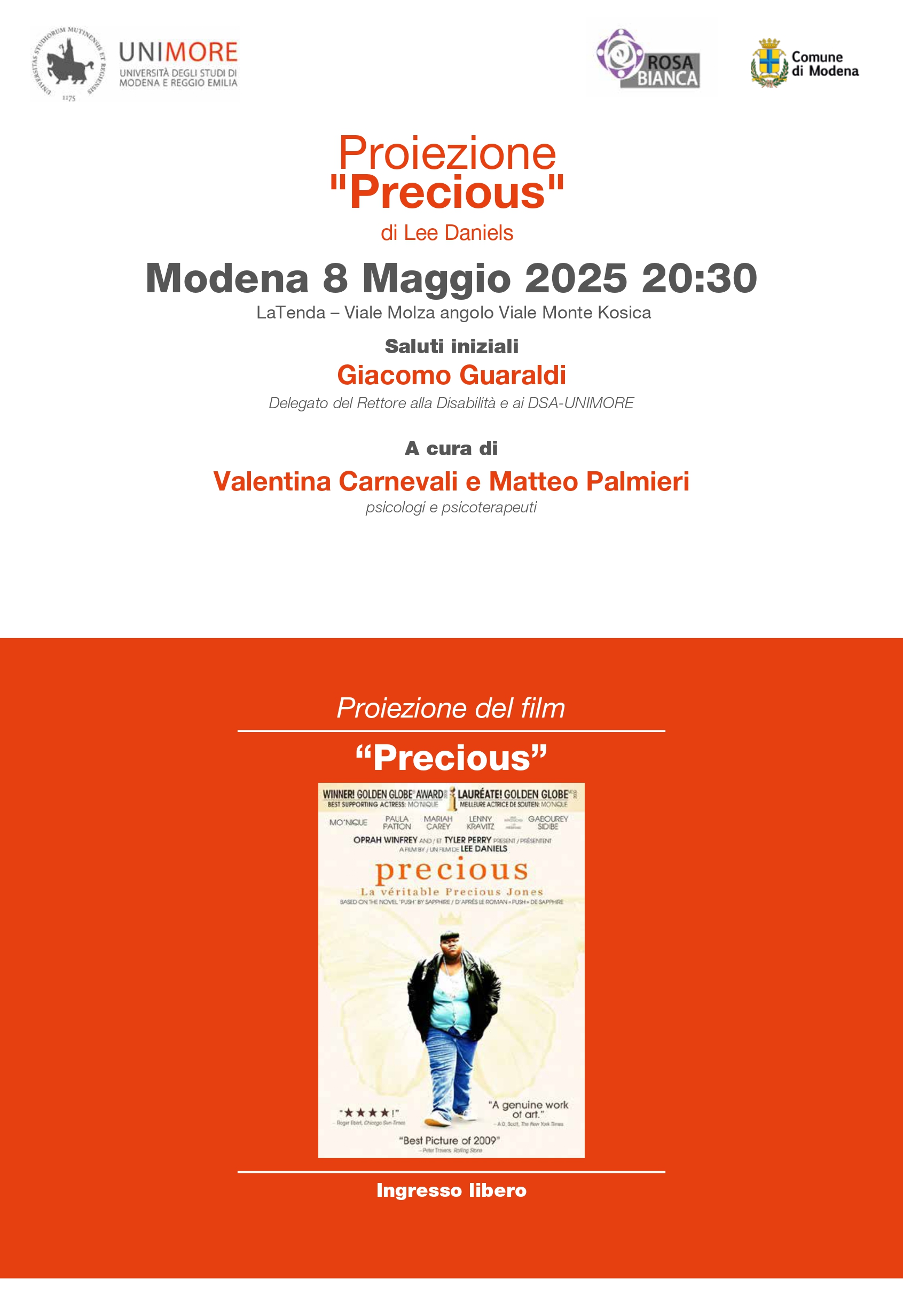 Proiezione del Film “Precious”Regia di Lee DanielsCon la partecipazione di: Valentina Carnevali Psicologa e Psicoterapeuta eMatteo Palmieri Psicologo e Psicoteraputa